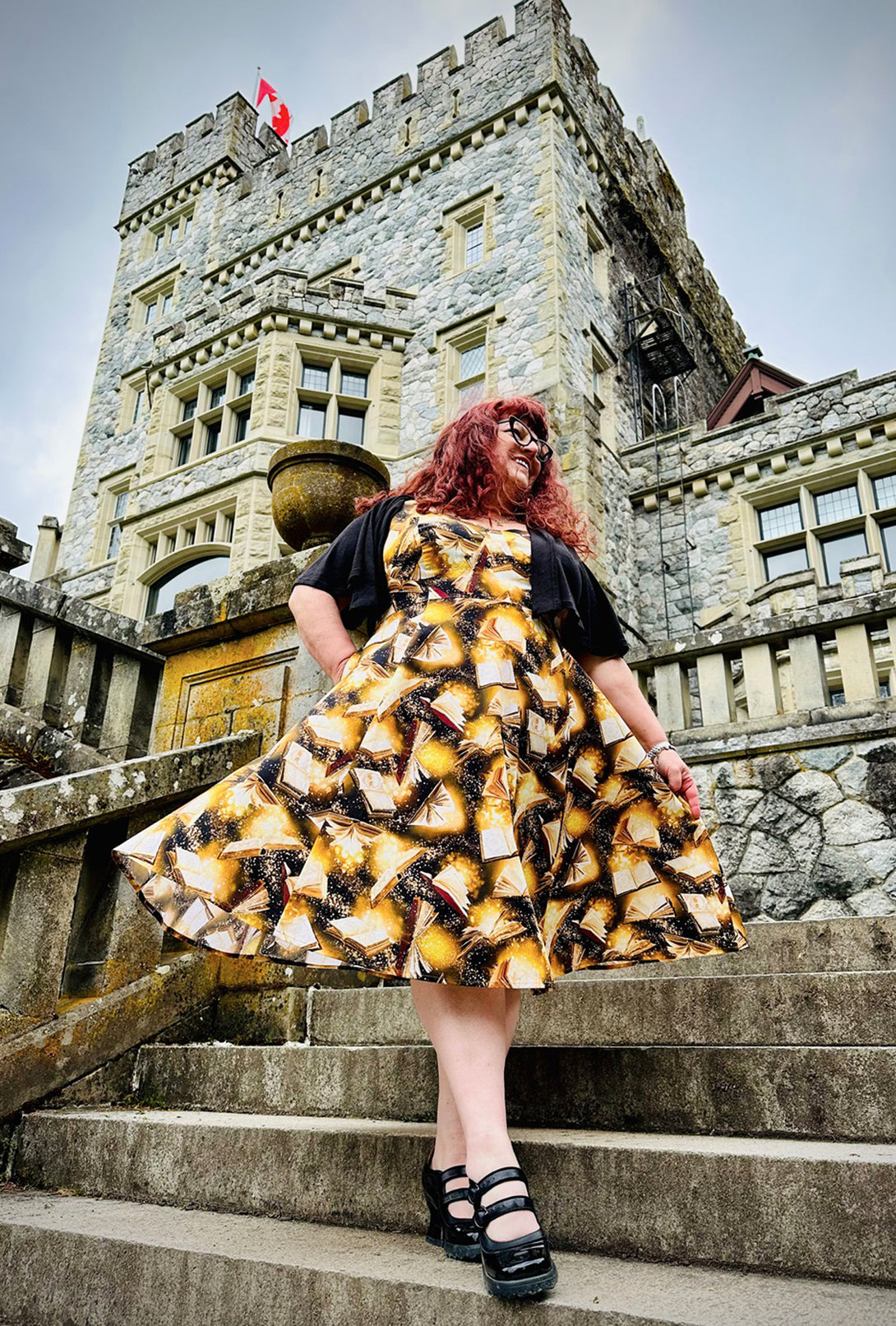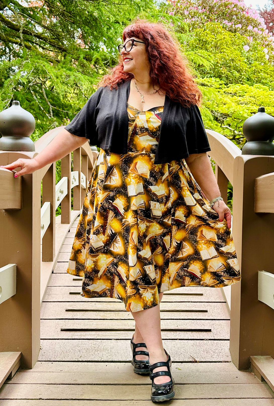 Bewitch them with this enchanted book-embellished dress. Its whimsical detailing showcases glittering tomes and traditionally bound volumes magically flying through the air. Show off your love of literature with a dash of enchantment in style.