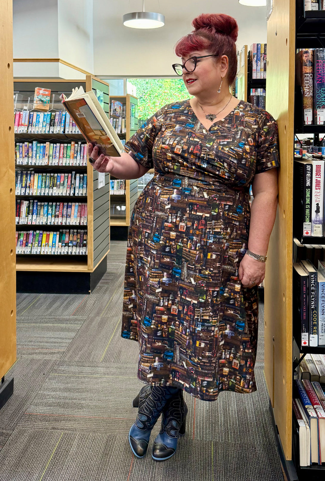 Bewitch them with this enchanted book-embellished dress. Its whimsical detailing showcases glass potion bottles precariously perched atop stacks of traditional leather-bound books (or perhaps grimoires!). Show off your love of literature and a dash of magic in style. Love potion, anyone?