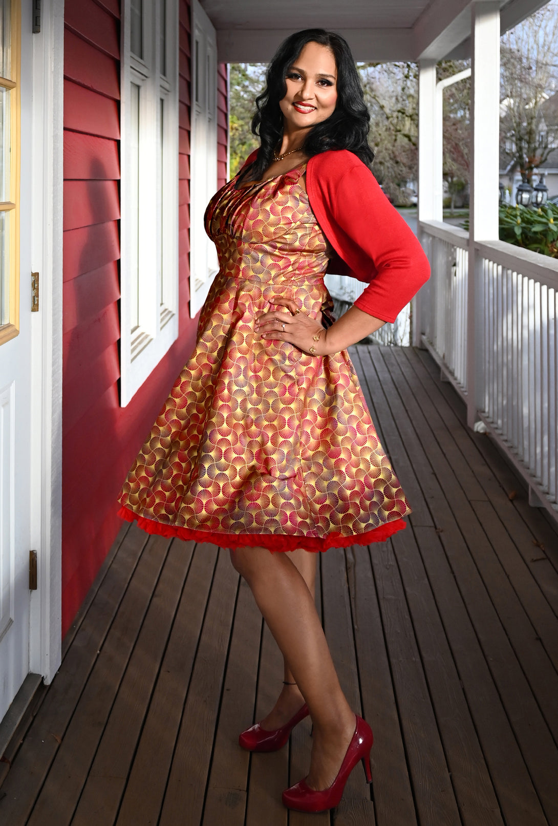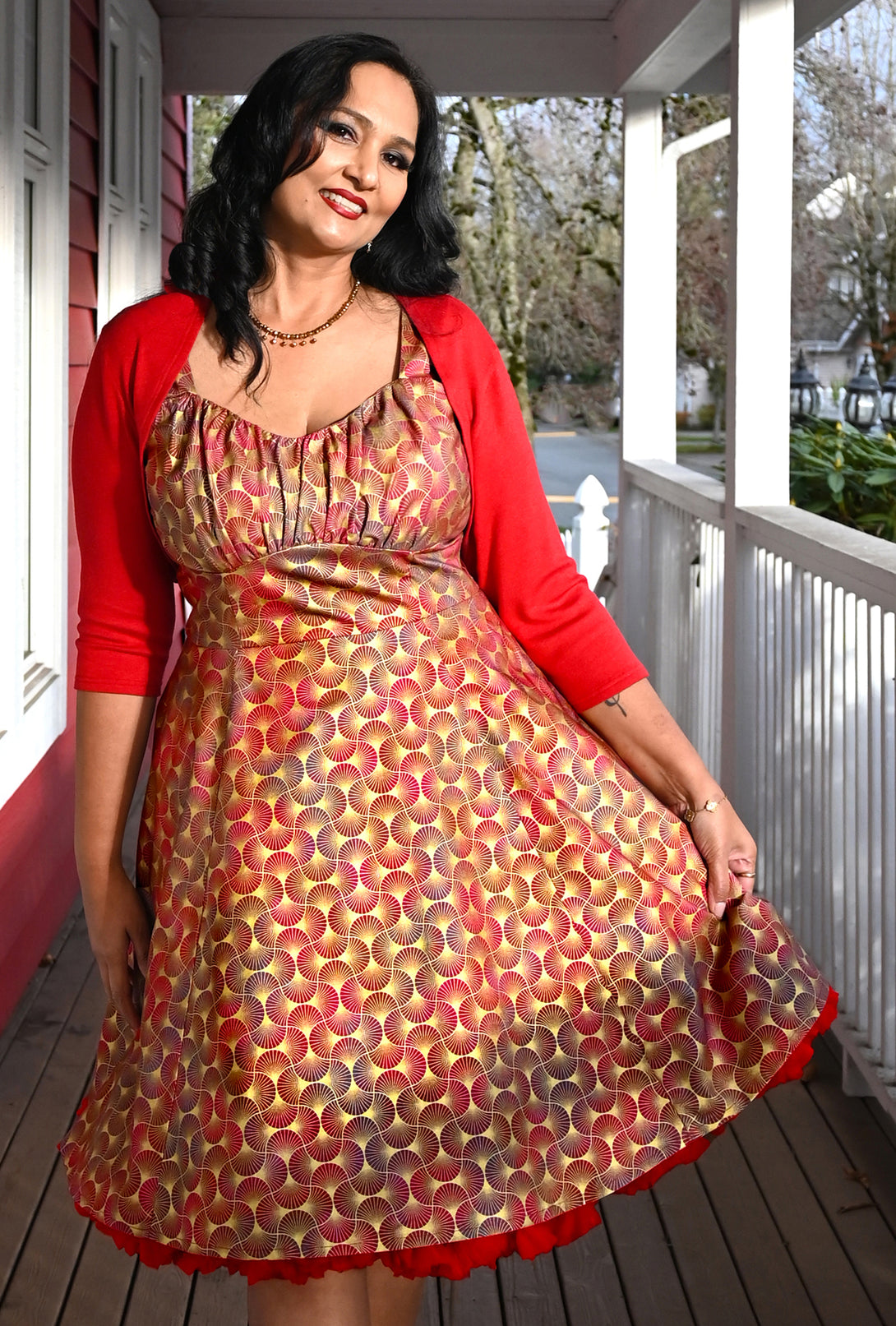 Get ready to dazzle in our Deco D’Or dress! Drenched in luscious shades of cherry and raspberry, this fit and flare beauty is brought to life with a shimmering gold metallic fan print, channeling the bold glamour of the Art Deco era. Perfect for an evening of 'putting on the ritz'.