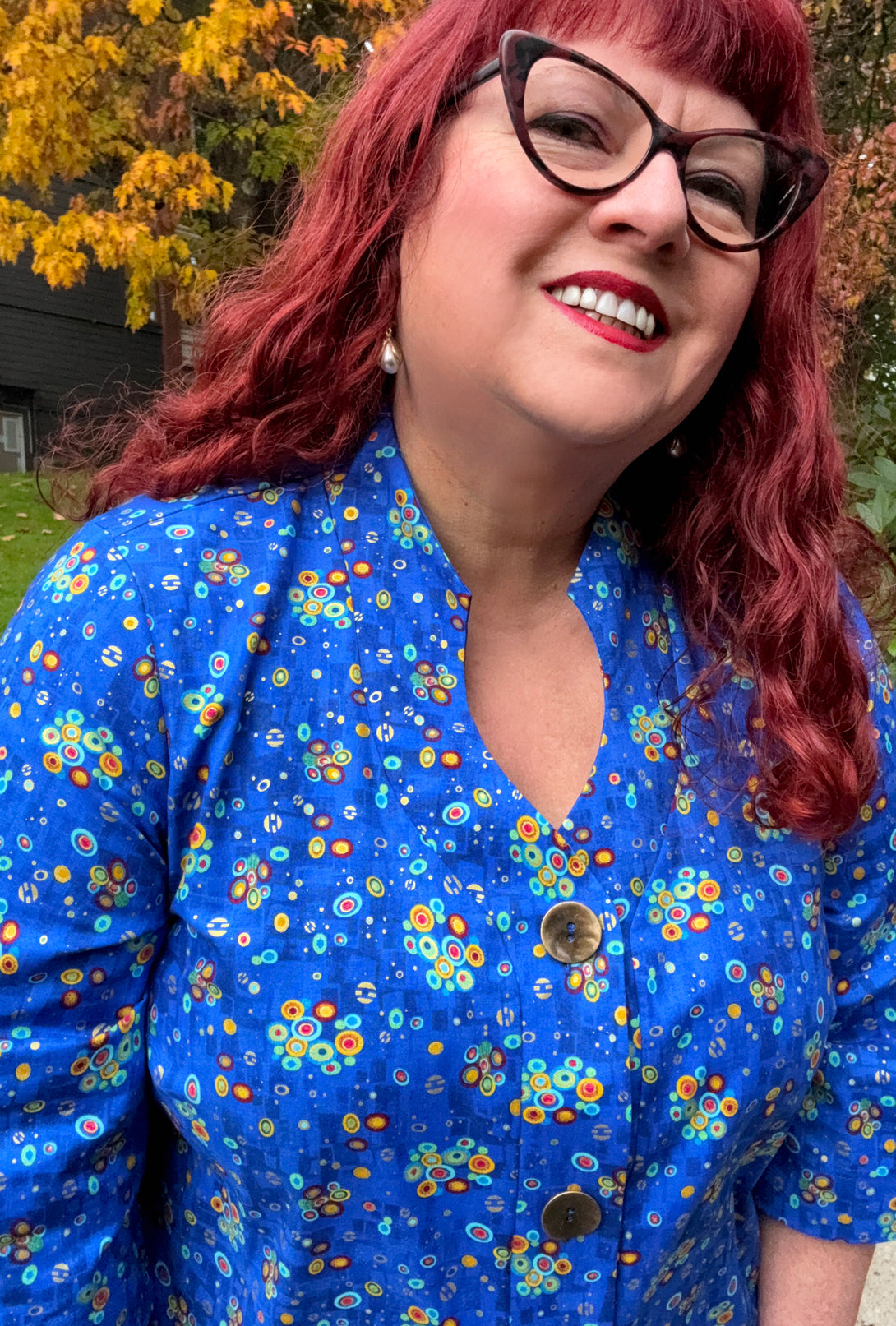 Get ready to mesmerize! The Hypdotic Coat Dress is your ticket to a mid-century moment with a kaleidoscope of electric blue and vibrant circles that seem to dance right off the fabric.