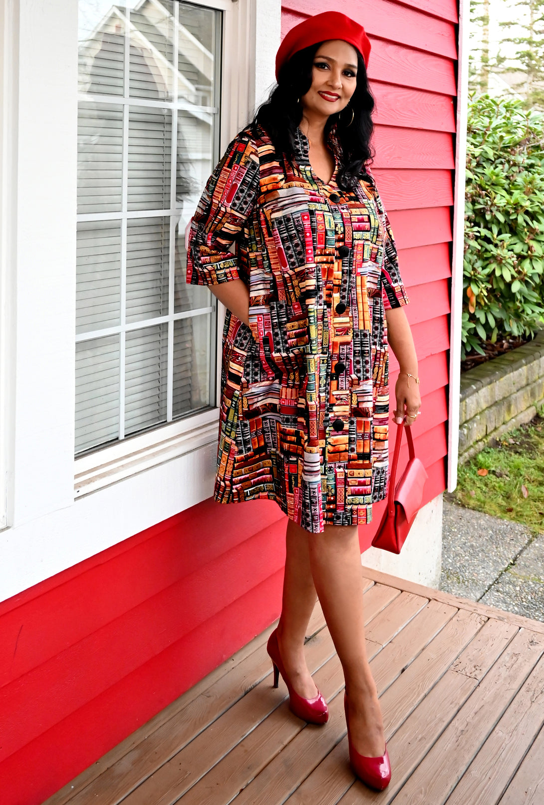 Wear it as a matching set with the Page Turner - Norma Dress for double the drama, or let it shine solo as a dress or statement coat. Featuring a sleek stand-up collar, flattering V neckline, cropped ¾ sleeves, side seam pockets, and an easy A-line silhouette, it’s classic with a modern wink.