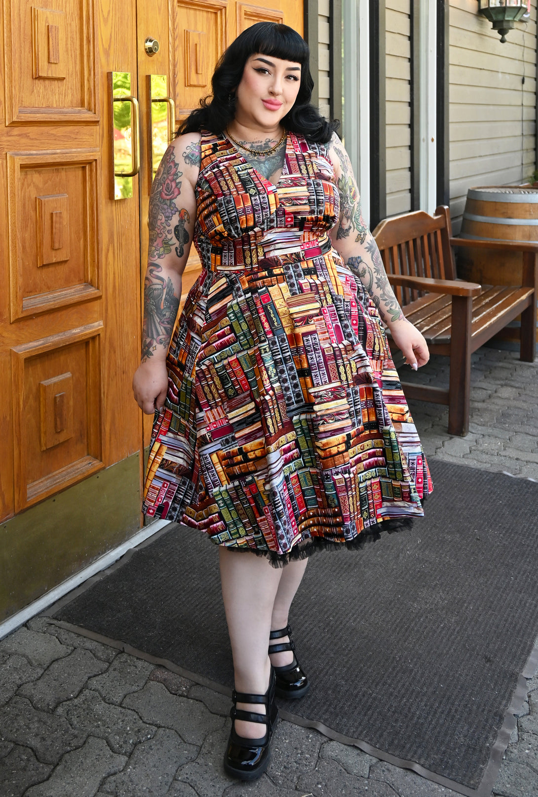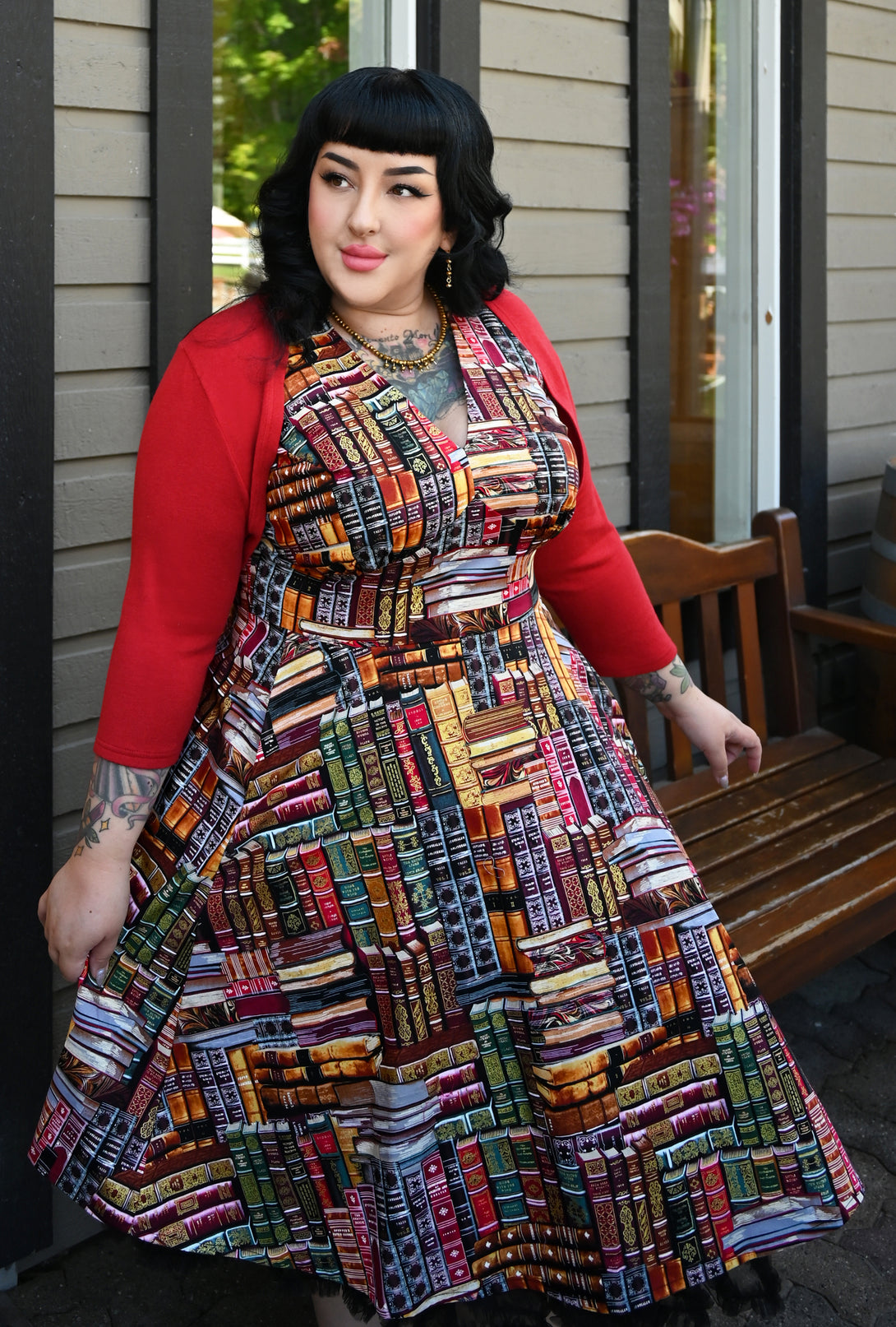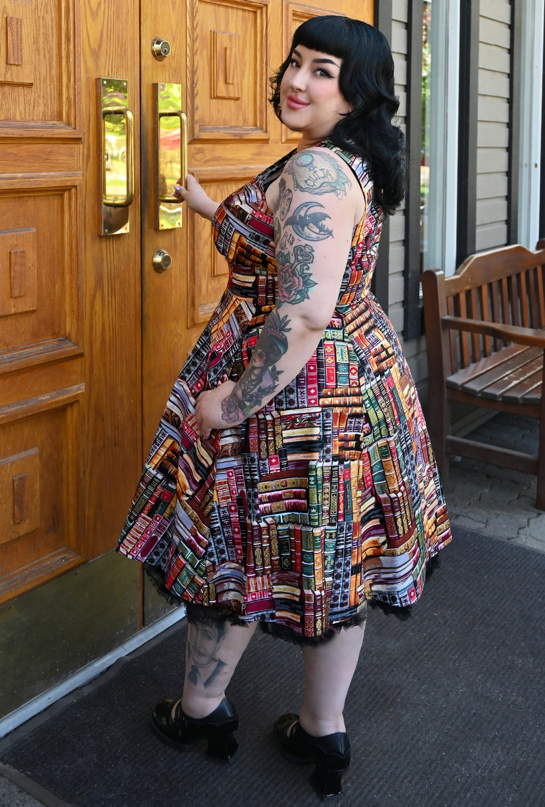 Show off your literary flair with 'Page Turner'. One of our most popular prints of all time, we've brought it back! This bookish fashion favourite is brimming with rows of classic, leather-bound volumes, each detail crafted for book lovers who swoon over retro style fashion. Tucked among the shelves, golden highlights glimmer on well-worn gilded spines, catching the light just so. Whether you’re charming your book club, browsing dusty stacks, or giving off chic librarian energy, this dress is a true classic that delivers cover to cover charm.