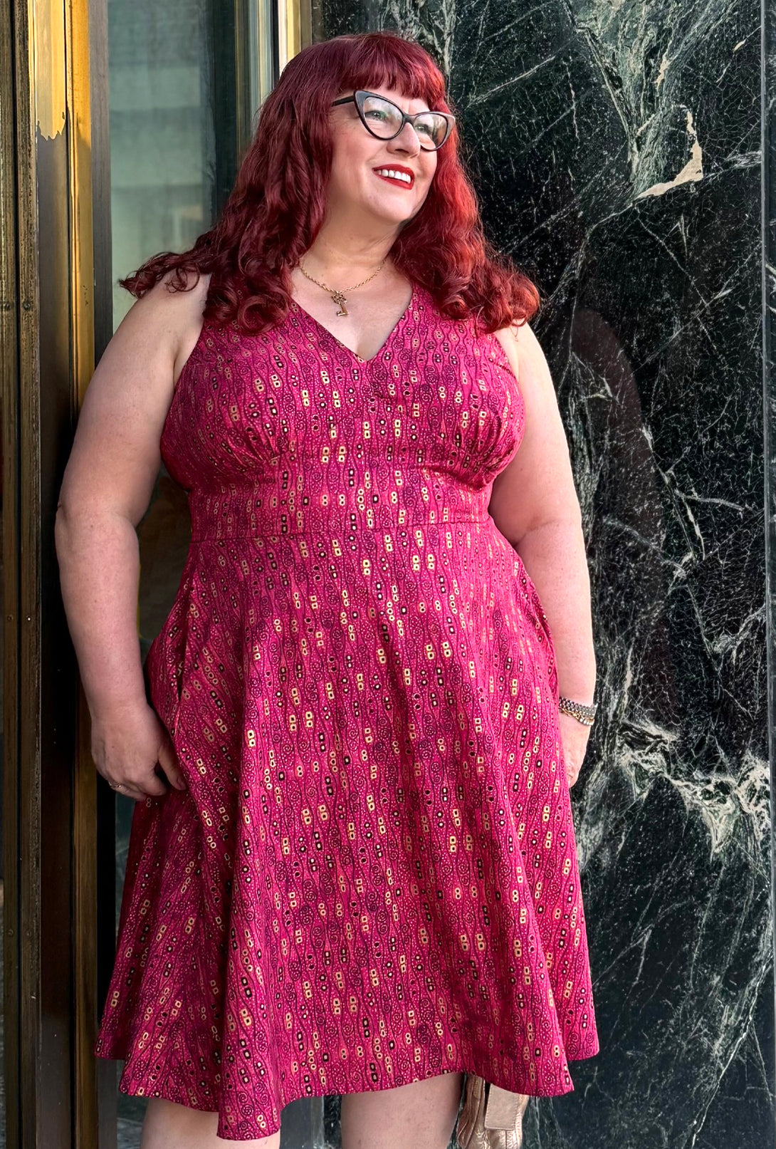The Norma Wiggle Room dress gives off seriously cool retro vibes with its groovy deep pink waves, swinging spirals and subtle pops of gold. It’s like a contemporary nod to mid-century mod, where bold patterns and wavy lines ruled the scene.