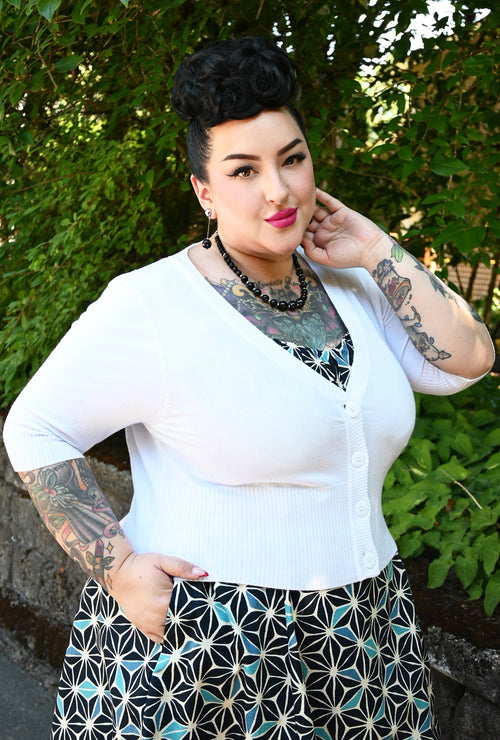 Named after Canadian (BC-born) starlet Yvonne De Carlo, this dress captures timeless glamour with an easy to wear silhouette. Featuring a wider, work appropriate V-neckline that keeps bra straps discreetly covered, short sleeves and a flattering fitted bodice, it flows into a full skirt designed to pair beautifully with one of our regular-length petticoats for extra volume. An invisible back zipper ensures a smooth fit, while generously sized pockets bring modern practicality to this classic style.