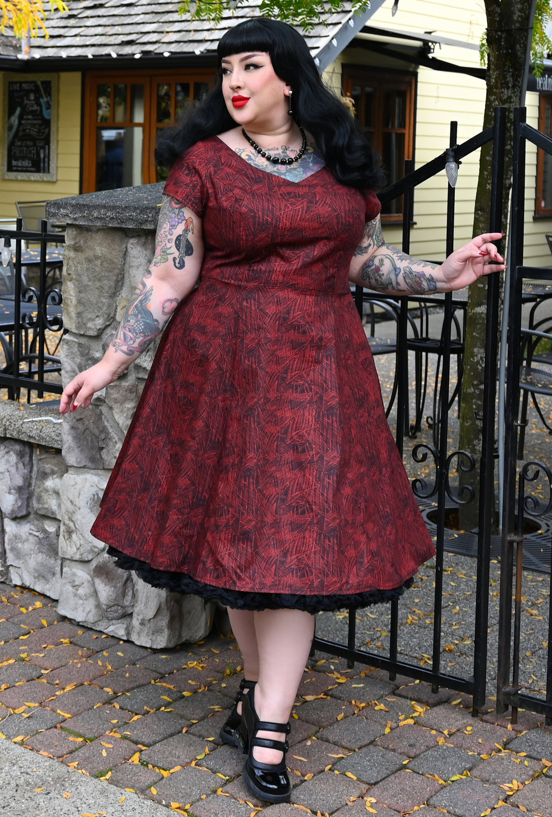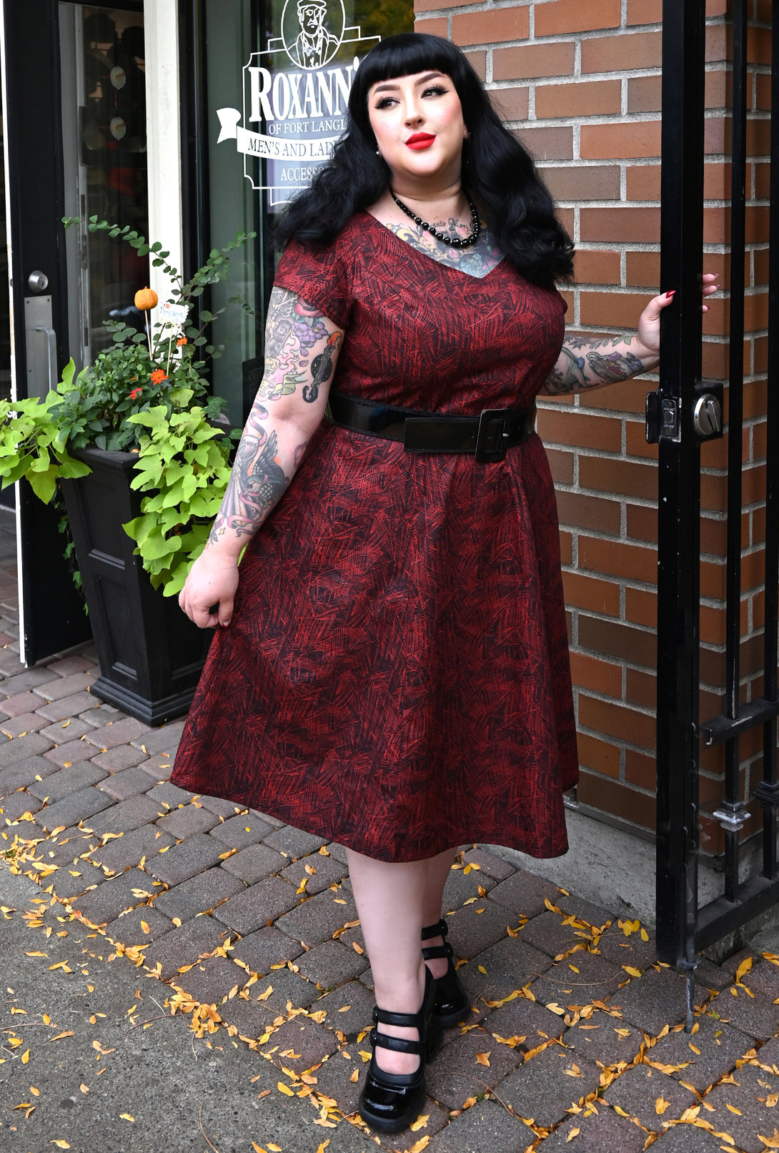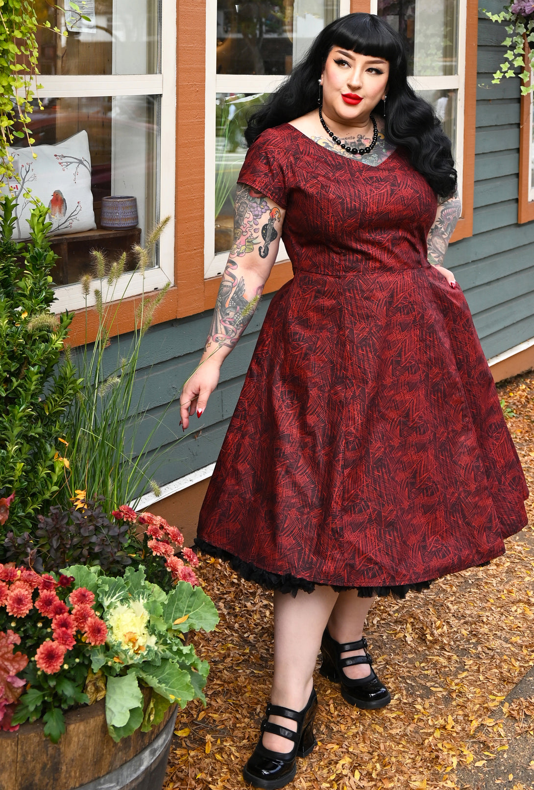 Named after Canadian (BC-born) starlet Yvonne De Carlo, this dress captures timeless glamour with an easy to wear silhouette. Featuring a wider, work appropriate V-neckline that keeps bra straps discreetly covered, short sleeves and a flattering fitted bodice, it flows into a full skirt designed to pair beautifully with one of our regular-length petticoats for extra volume. An invisible back zipper ensures a smooth fit, while generously sized pockets bring modern practicality to this classic style.
