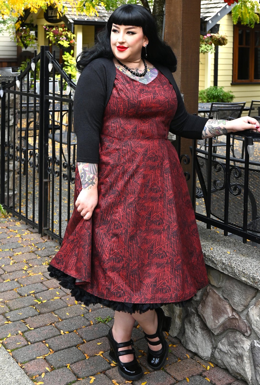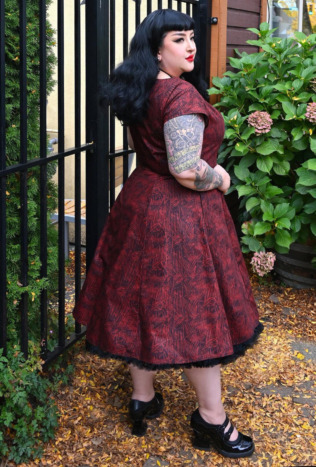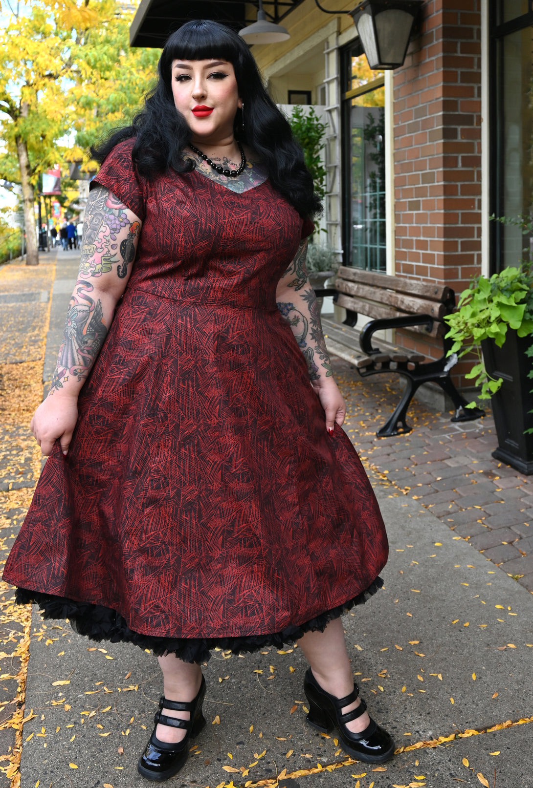 Named after Canadian (BC-born) starlet Yvonne De Carlo, this dress captures timeless glamour with an easy to wear silhouette. Featuring a wider, work appropriate V-neckline that keeps bra straps discreetly covered, short sleeves and a flattering fitted bodice, it flows into a full skirt designed to pair beautifully with one of our regular-length petticoats for extra volume. An invisible back zipper ensures a smooth fit, while generously sized pockets bring modern practicality to this classic style.