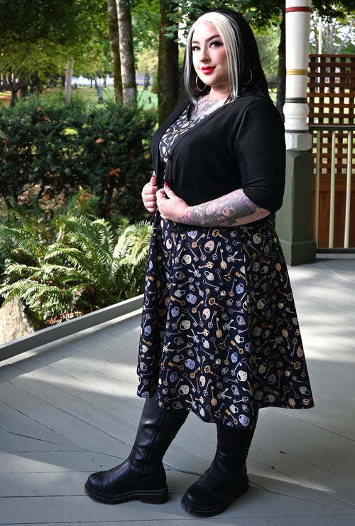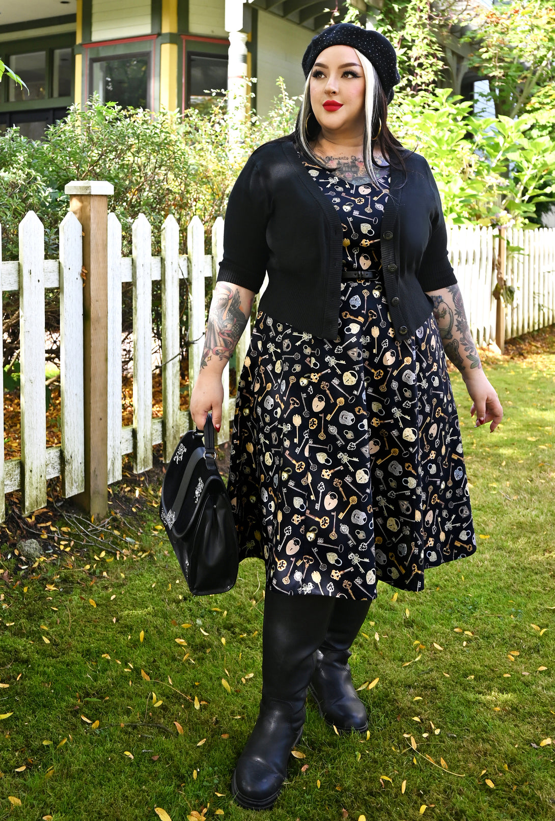 Unlock instant charm with Lock Star. Featuring a cascade of antique keys and heart shaped locks on a black background, this dress has a little mystery, a little romance and a whole lot of allure. It’s the perfect pick for anyone who knows the key to great style is a little whimsy!