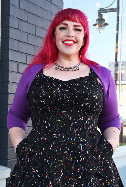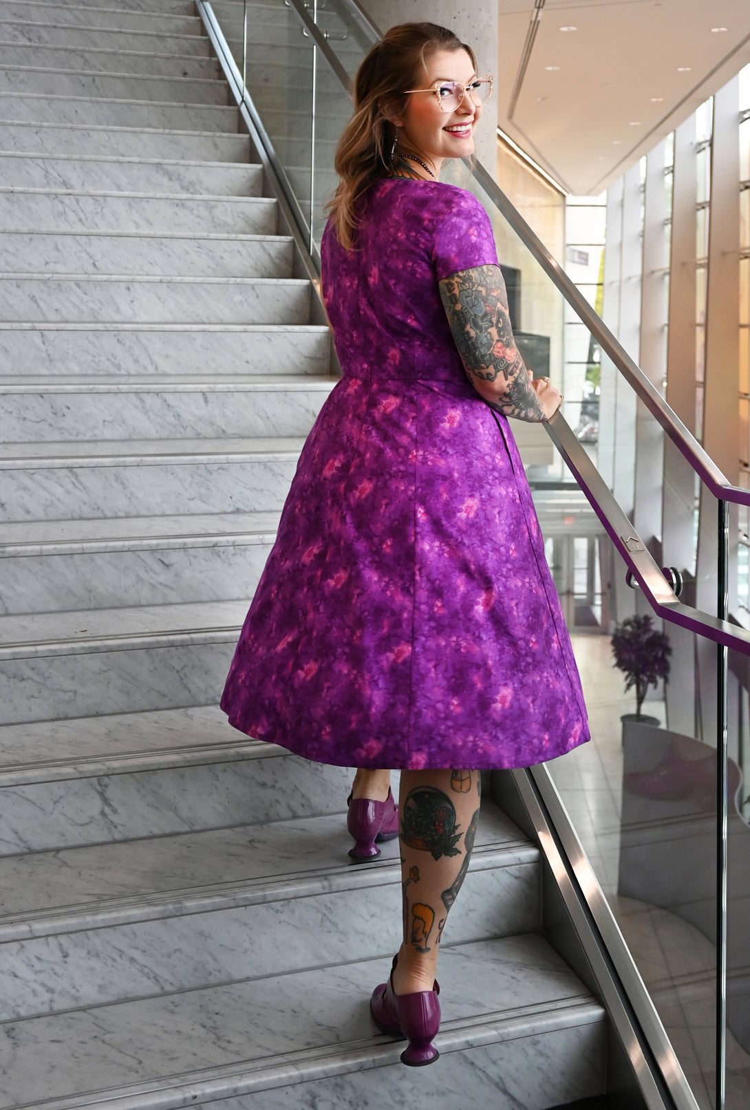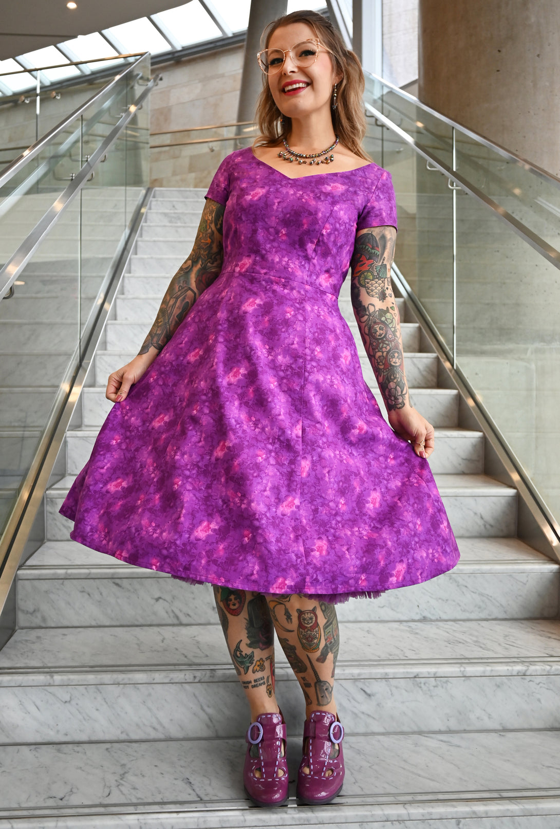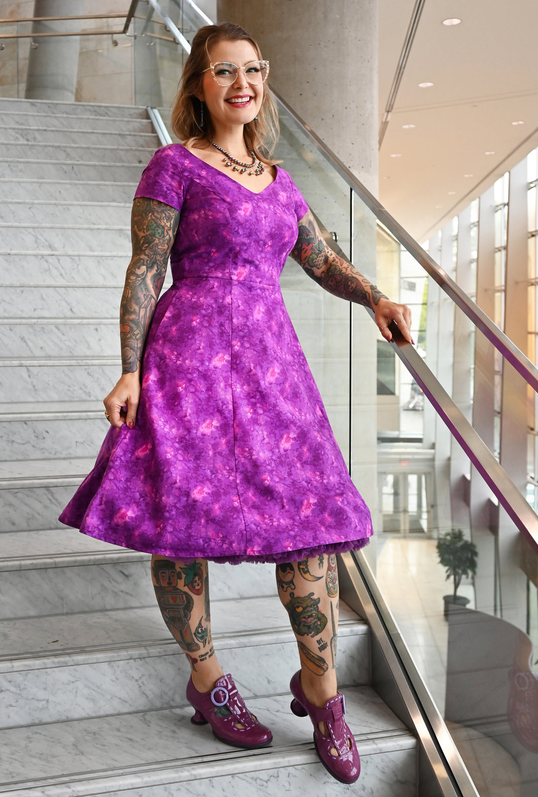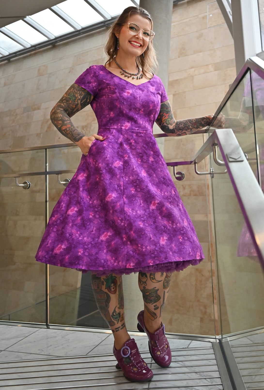Named after Canadian (BC-born) starlet Yvonne De Carlo, this dress captures timeless glamour with an easy to wear silhouette. Featuring a wider, work appropriate V-neckline that keeps bra straps discreetly covered, short sleeves and a flattering fitted bodice, it flows into a full skirt designed to pair beautifully with one of our regular-length petticoats for extra volume. An invisible back zipper ensures a smooth fit, while generously sized pockets bring modern practicality to this classic style.